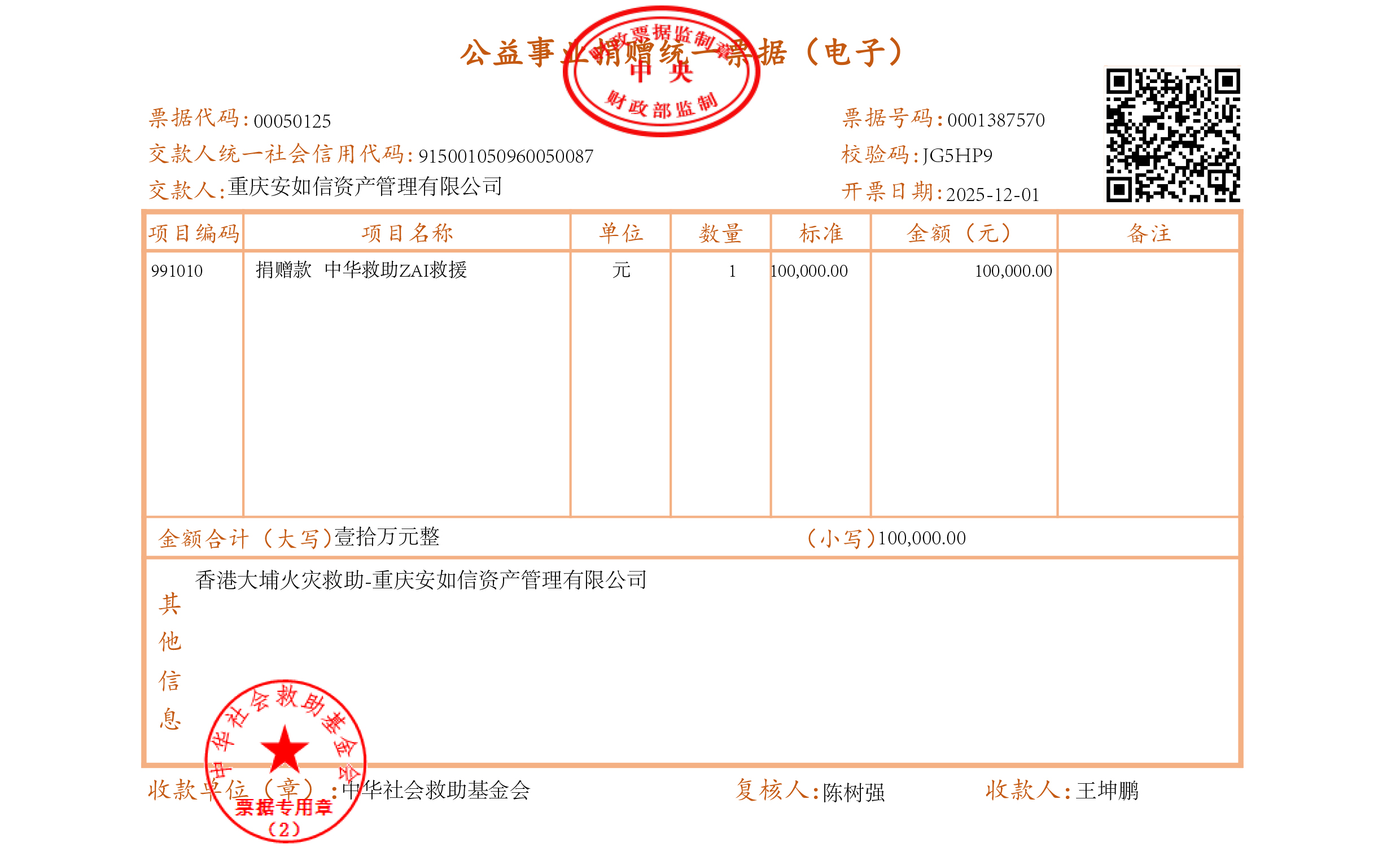 面对同胞困境,安如信通过中华社会救助基金会捐赠 100000元人民币,专项用于大埔火灾受灾群众的医疗救助、生活物资补给及灾后重建工作。